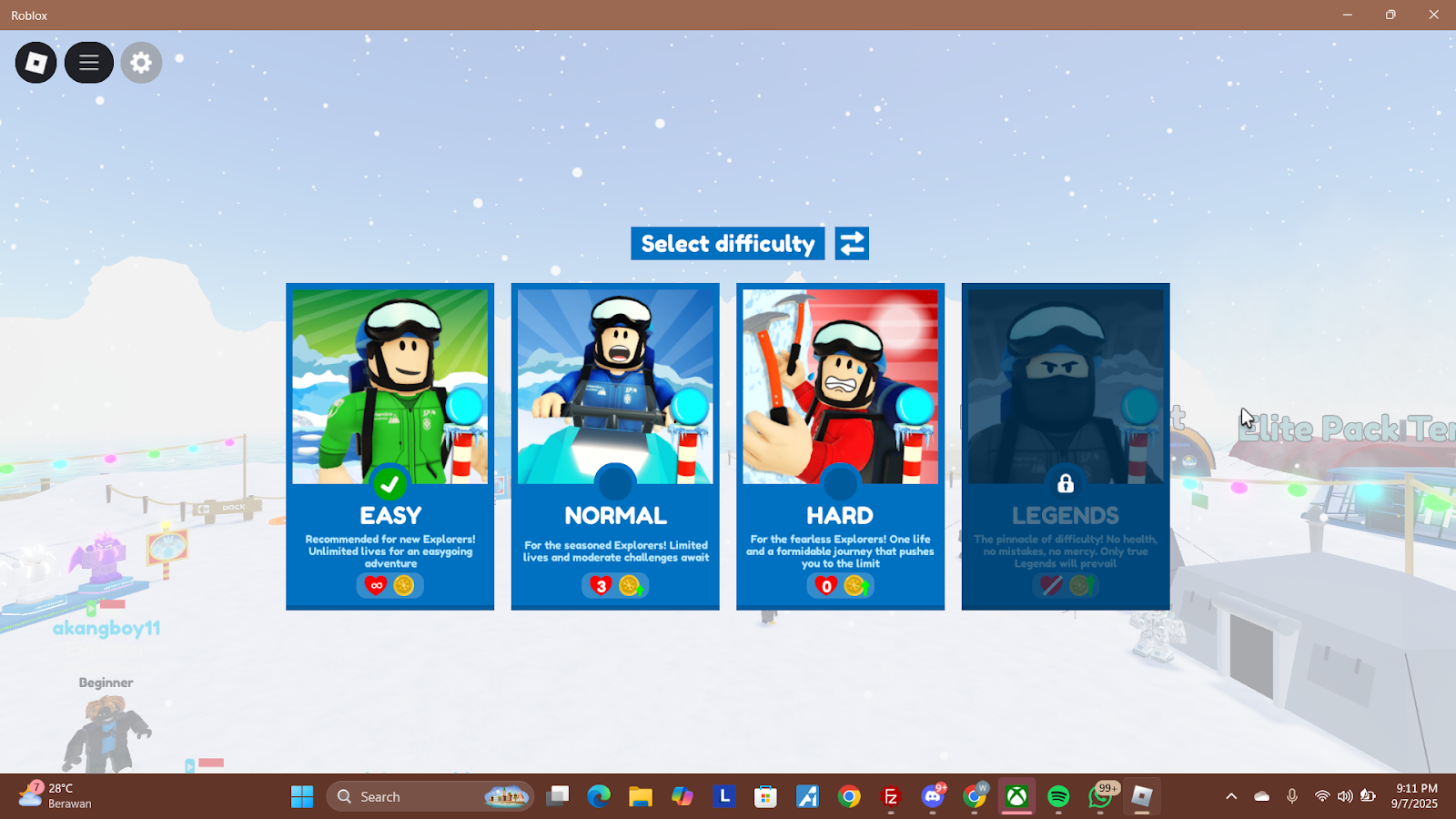 Oh iya untuk membuka mode hard, pemain perlu mencapai kutub selatan atau submit sekali di mode easy atau normal. lalu untuk mode legends harus submit mode hard satu kali.