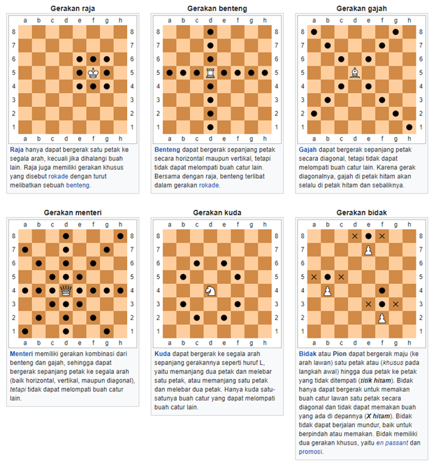 Permainan dilangsungkan di atas papan yang terdiri dari 8 lajur dan 8 baris kotak/petak berwarna hitam dan putih (atau terang dan gelap) secara berselang seling. Permainan dimulai dengan 16 buah pada masing-masing pihak, yang disusun berbaris secara khusus pada masing-masing sisi papan catur secara berhadap-hadapan. Satu buah hanya bisa menempati satu petak. Pada bagian terdepan masing-masing barisan - terdapat 8 pion, diikuti di belakangnya dua benteng, dua kuda (dalam bahasa Inggris disebut knight-ksatria), dua gajah (dalam bahasa Inggris disebut bishop-uskup), satu menteri atau ratu atau ster, serta satu raja.